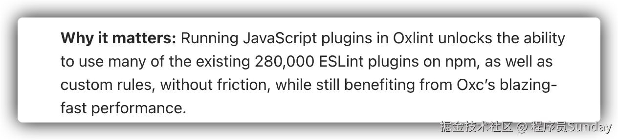 过去,Oxlint 虽然凭借 Rust 的高性能 ,在 lint 速度上吊打 ESLint,但有一个巨大缺陷:不能用 ESLint 插件。