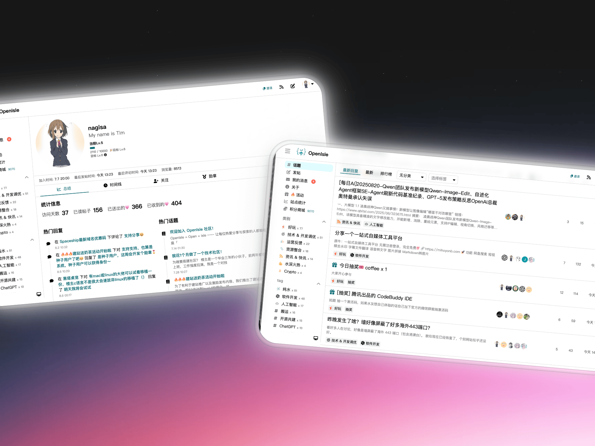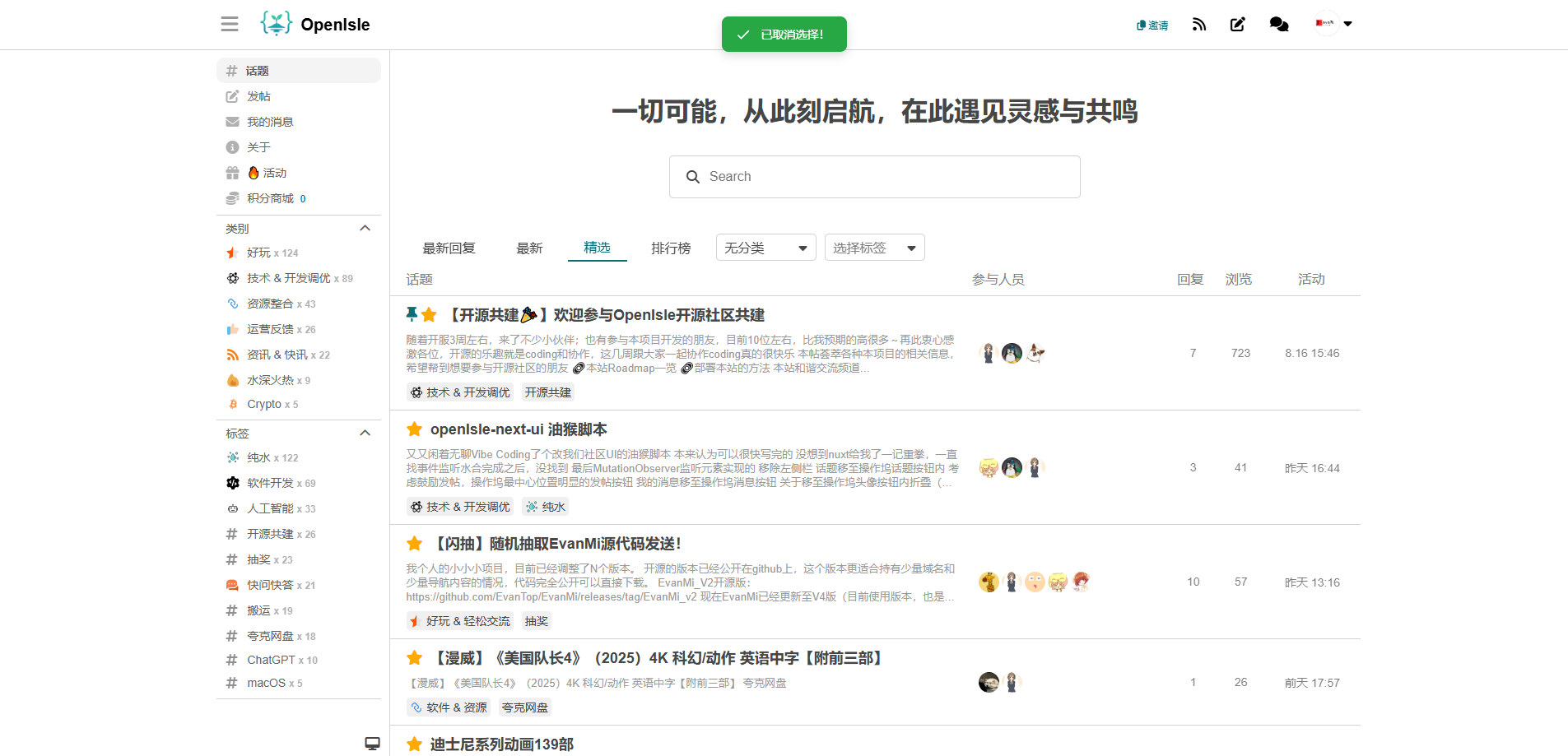 如果你想搭建一个技术交流社区或者是兴趣爱好圈子,OpenIsle 都能满足需求。你可以根据自身需求,对其进行定制化开发,打造一个独一无二的社区空间~