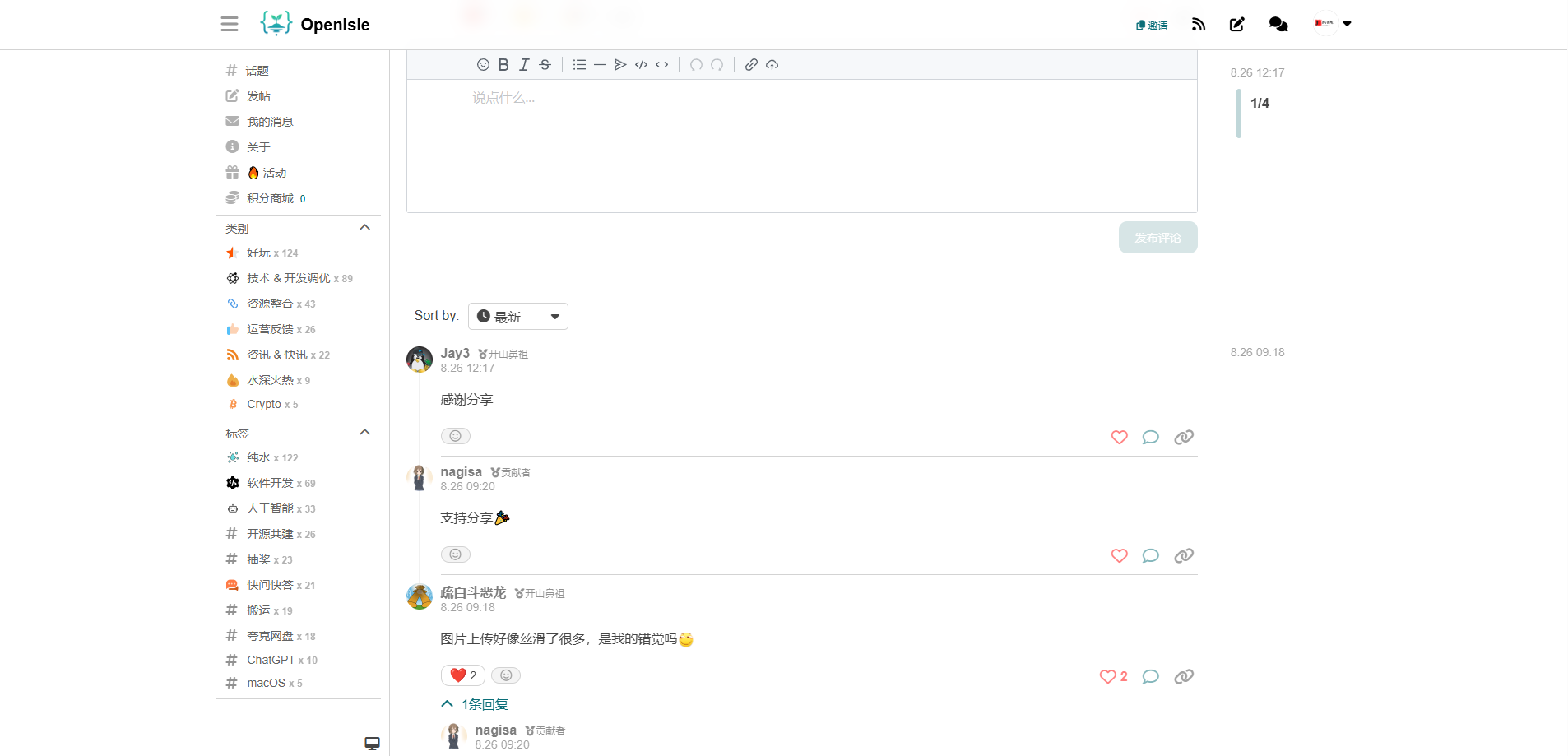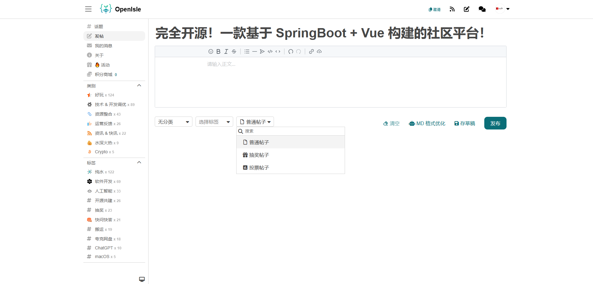 OpenIsle ------ 一个使用 SpringBoot 和 Vue3 构建的全栈开源社区平台,提供用户注册、登录、贴文发布、评论交互等完整功能,可用于项目社区或直接打造自主社区站点。