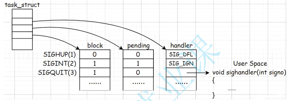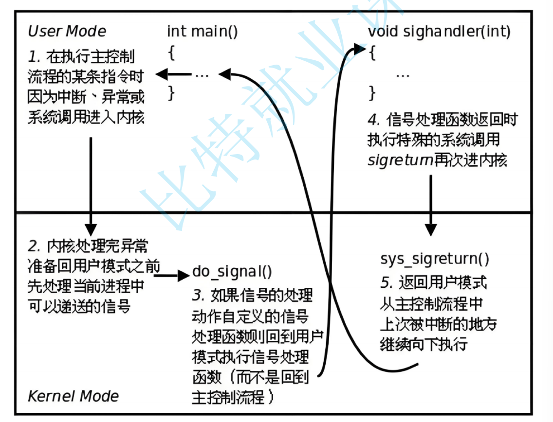 如果是自定义信号处理函数,内核在处理该信号时,就需要切换到⽤⼾态执⾏这个处理函数