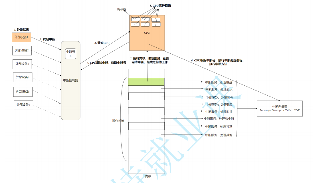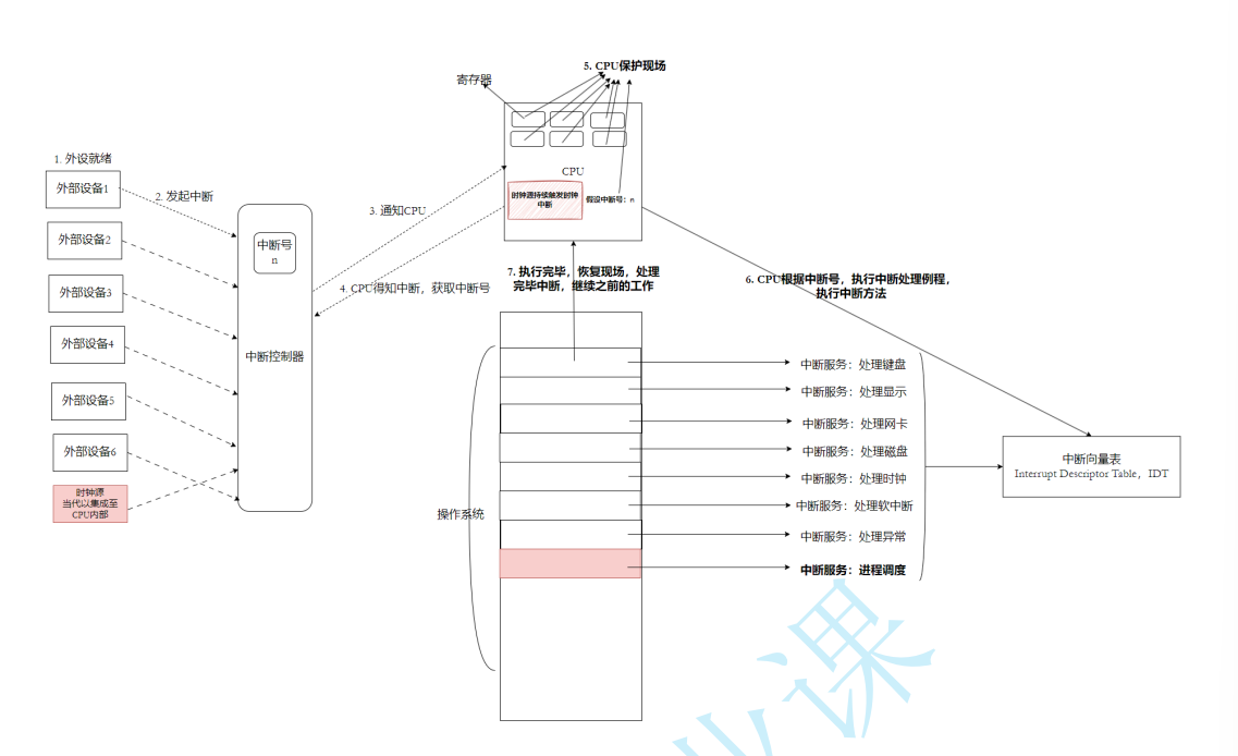 外设向中断控制器发送中断请求,然后中断控制器生成中断号,设置指定cpu的中断引脚,然后cpu进入指令的中断周期后检查if开中断寄存器和中断引脚,然后cpu获取中断号,切换内核态,保存寄存器组到内核栈中,更新寄存器组,根据中断号查中断向量表在内核栈中执行中断方法,执行完后从内核栈中恢复寄存器组,切换回用户态