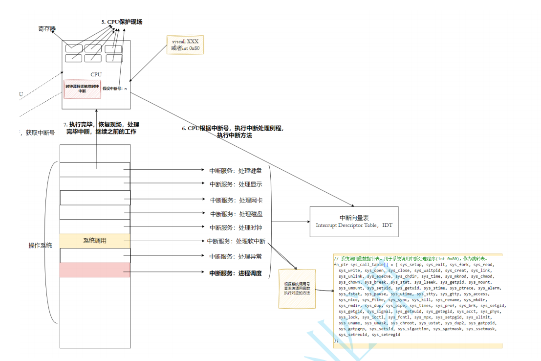为了让操作系统⽀持系统调⽤,CPU也设计了对应的汇编指令(int 0x80或者 syscall),可以让CPU主动触发中断逻辑。