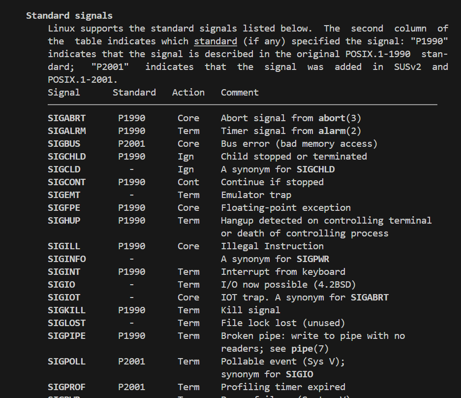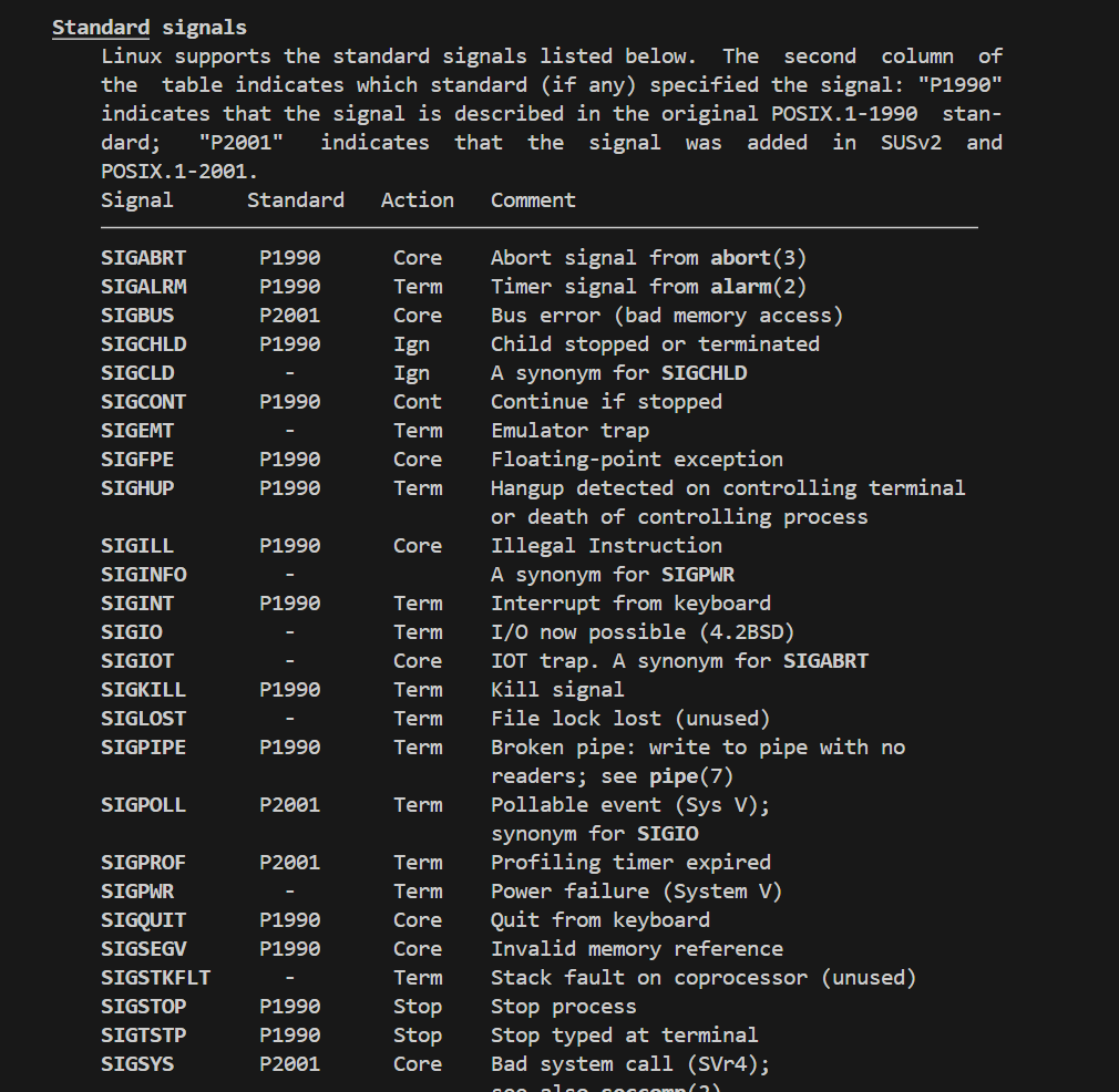 4、信号各⾃在什么条件下产⽣,默认的处理动作是什么,可通过 man 7 signal命令查看