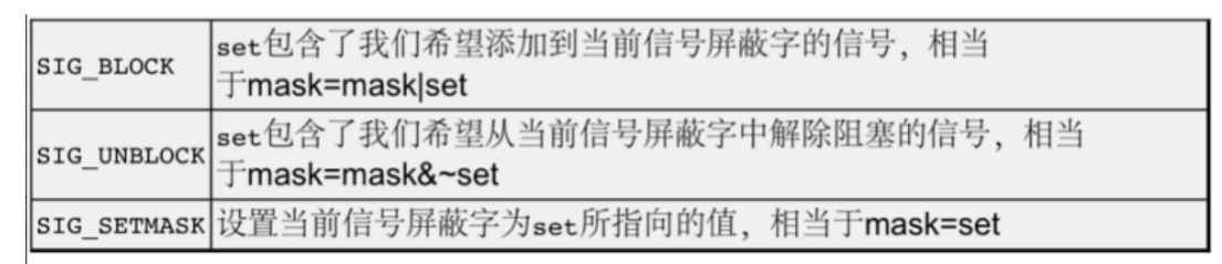 如果set是⾮空指针,则更改进程的信号屏蔽字,参数how指⽰如何更改。如果oset和set都是⾮空指针,则先将原来的信号屏蔽字备份到oset⾥,然后根据set和how参数更改信号屏蔽字。假设当前进程的信号屏蔽字为mask,下表说明了how参数的可选值