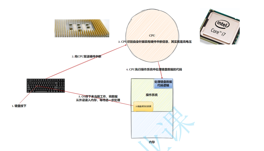 键盘按下会给中断控制器发送中断请求,中断控制器通知指定cpu,然后cpu执行中断函数将键盘输入给转成ascii码,写进输入事件缓冲区,该中断函数结束,然后Wayland守护进程可读事件就绪,将输入事件缓冲区中的数据通过进程间通信发送给终端模拟器进程,后面的就是终端模拟器进程将字符显示出来,然后写进主设备文件里,终端驱动将数据从主设备拷进从设备,终端的前台进程组会从从设备文件中读取数据