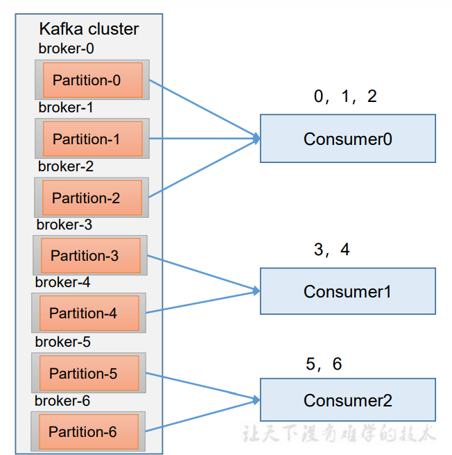 通过 partitions / consumer 来决定每个消费者应该消费几个分区。如果除不尽,那么前面几个消费者将会多消费 1 个分区。