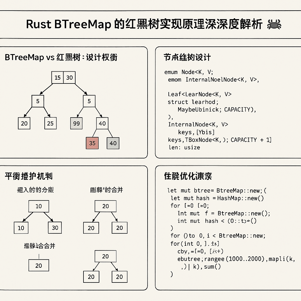 Rust 标准库中的 BTreeMap 是一个基于 B 树实现的有序映射集合,但其底层实现巧妙地融合了红黑树的平衡思想。理解其实现原理不仅能帮助我们更好地使用这个数据结构,更能深入领悟 Rust 的内存安全和性能优化哲学。