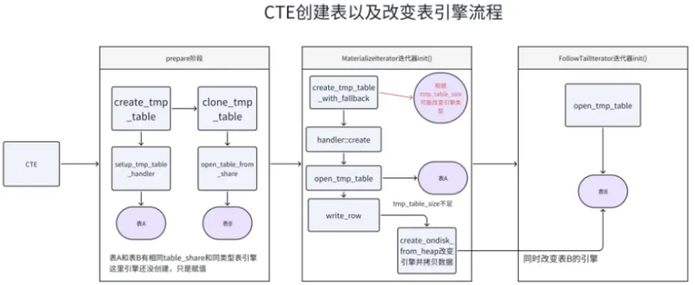 通过以上分析我们可以发现,带有CTE派生表的查询会在内部创建临时表用于储存中间数据,根据tmp_table_size值设置会影响临时表存放地方,如果tmp_table_size设置小了那么一开始就会从内存表改为创建落盘表,但是CTE内部涉及好几层迭代器,这时候每一层临时表的引擎都需要改,而导致报错的代码只改了其中一层的临时表,没有把别的引擎一起改了,最后导致问题。