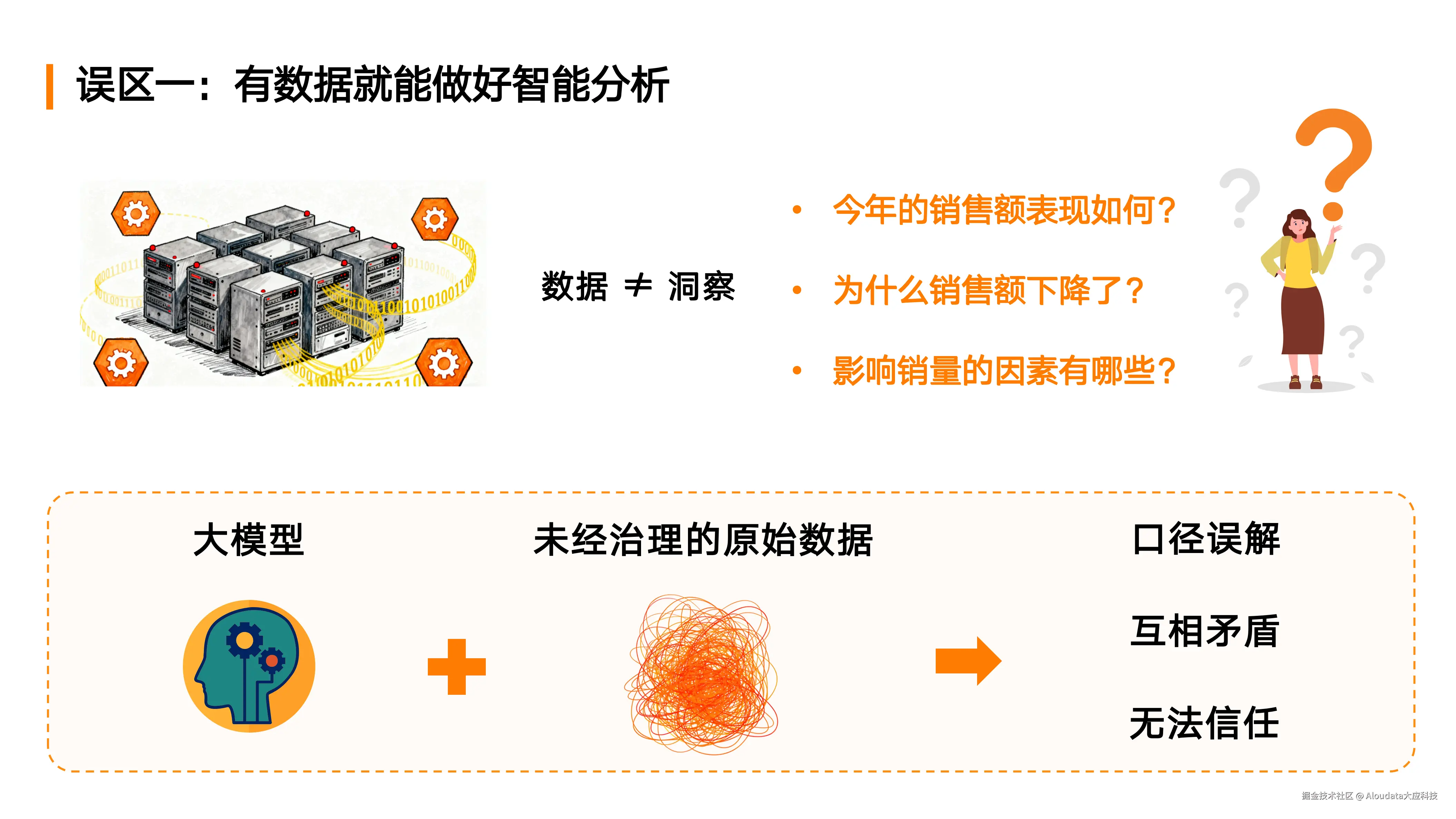 然而,在这条通往智能化的道路上,许多先行企业都陷入了一些误区,导致落地后"问不准"、"问不全"、"问不深",进而难以真正推广。那么企业级智能数据分析有哪些误区?采用怎样的技术方案才能让 Data Agent 不再是空中楼阁,而是真正可信且智能的业务伙伴呢?本文将给出 Aloudata 的答案。