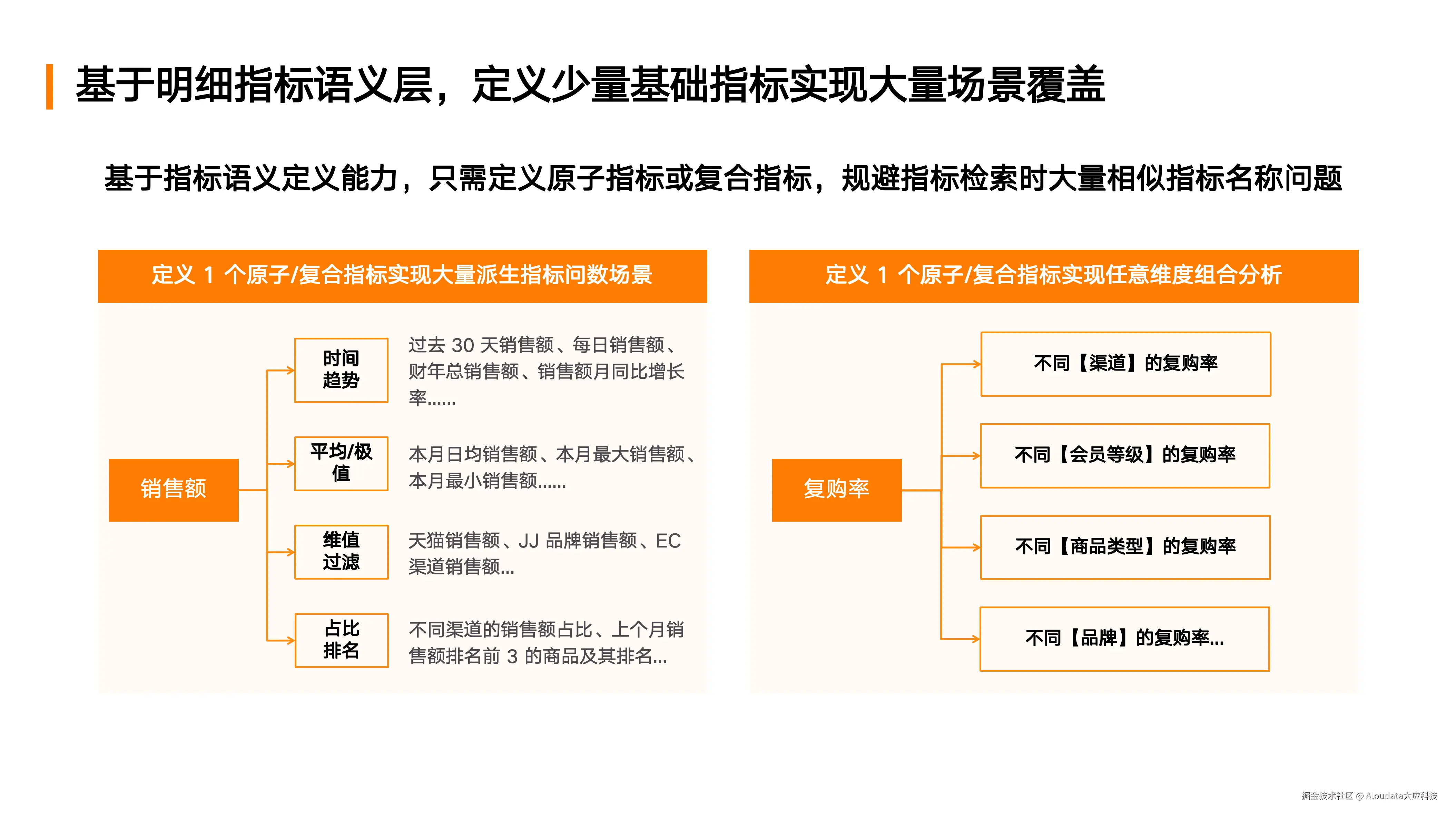 - 上层基于语义模型构建指标(基础指标、派生指标和复合指标)和维度。