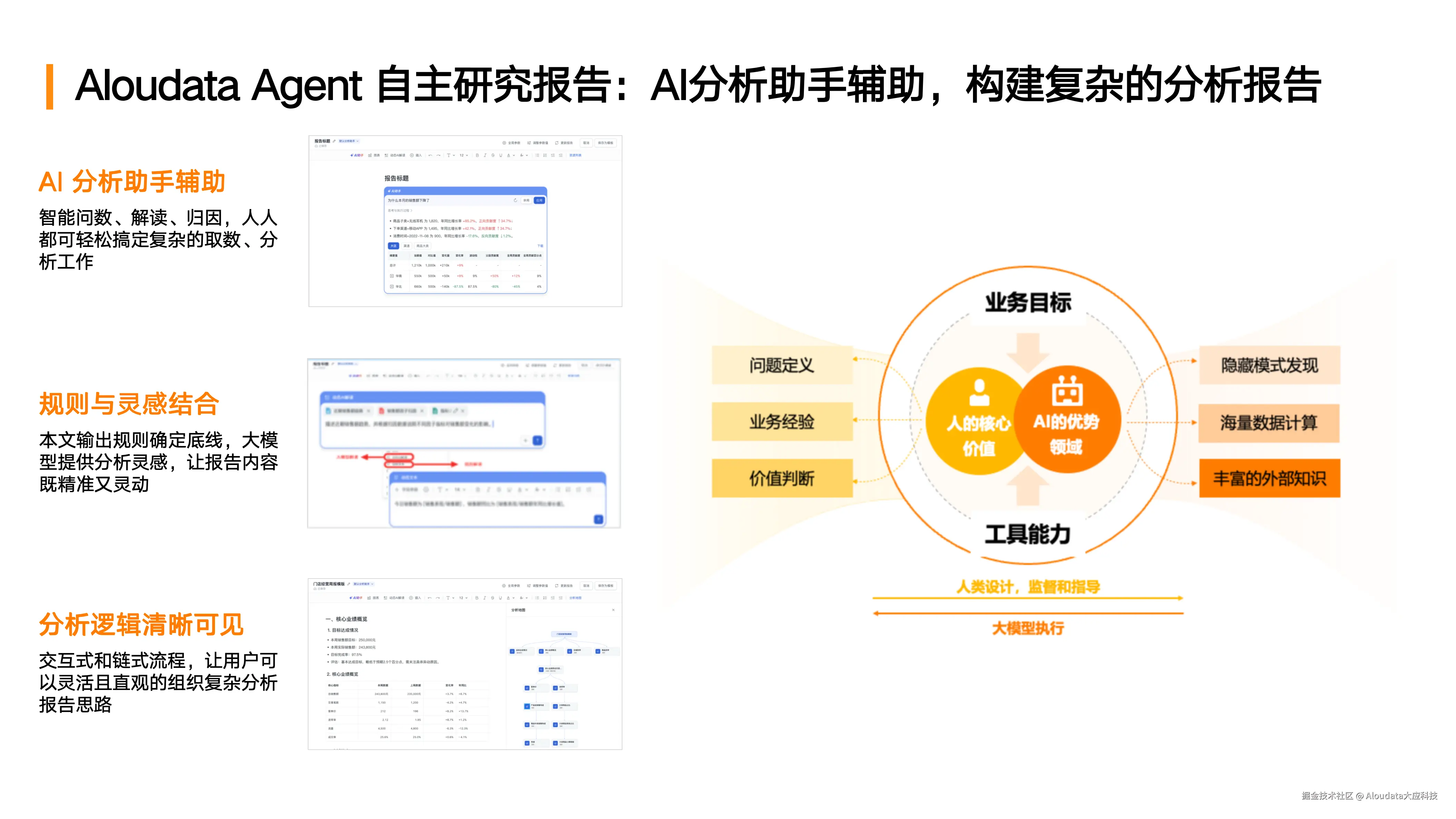 通过这三大能力的结合,Aloudata Agent 构建了从数据查询到归因分析,再到报告输出的完整闭环,真正实现了智能数据分析在企业场景下的深度落地。