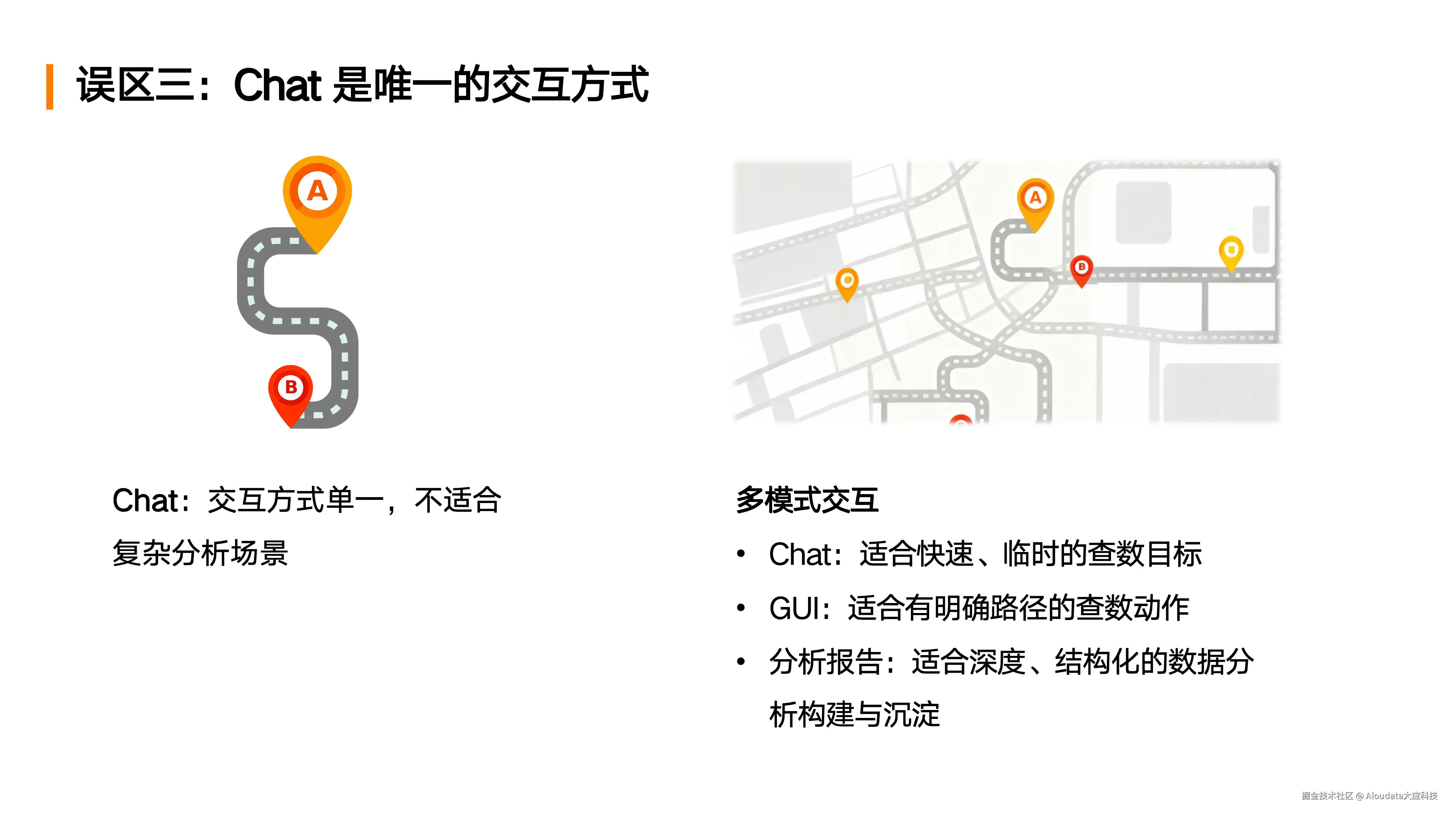 受主流大模型应用的影响,许多产品将"Chat"视为智能数据分析的唯一交互形式。然而,在复杂分析场景中,单一的聊天交互反而会限制用户与大模型的深度协作。当用户需要进行多步骤分析、对比不同假设场景或深入探索复杂的分析思路时,纯聊天界面往往导致对话冗长、上下文丢失。真正的解决方案需要融合多种交互模式------在保留对话自然性的同时,引入可视化操作、Notebook 式分析环境等专业工具的优势,打造更适合业务用户、更加高效的分析场域。