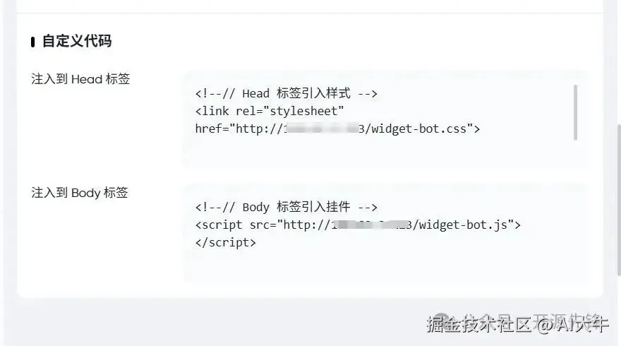 嵌入代码示例,复制到网站即可添加AI客服功能。