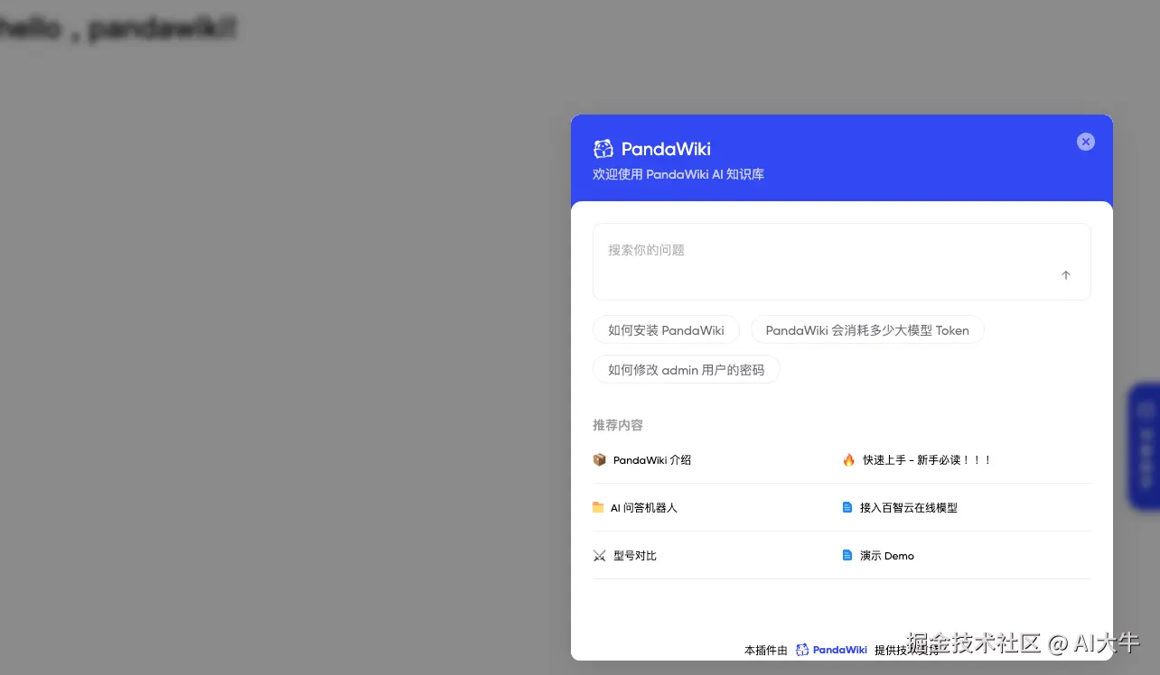 PandaWiki提供了灵活的嵌入方式。以官网为例,你只需在后台生成一段代码,复制到网站HTML中,网站右下角就会出现一个聊天小气泡。用户点开就能直接提问,AI基于知识库实时回答。这个过程超级简单,不需要懂技术,几步配置就能搞定。