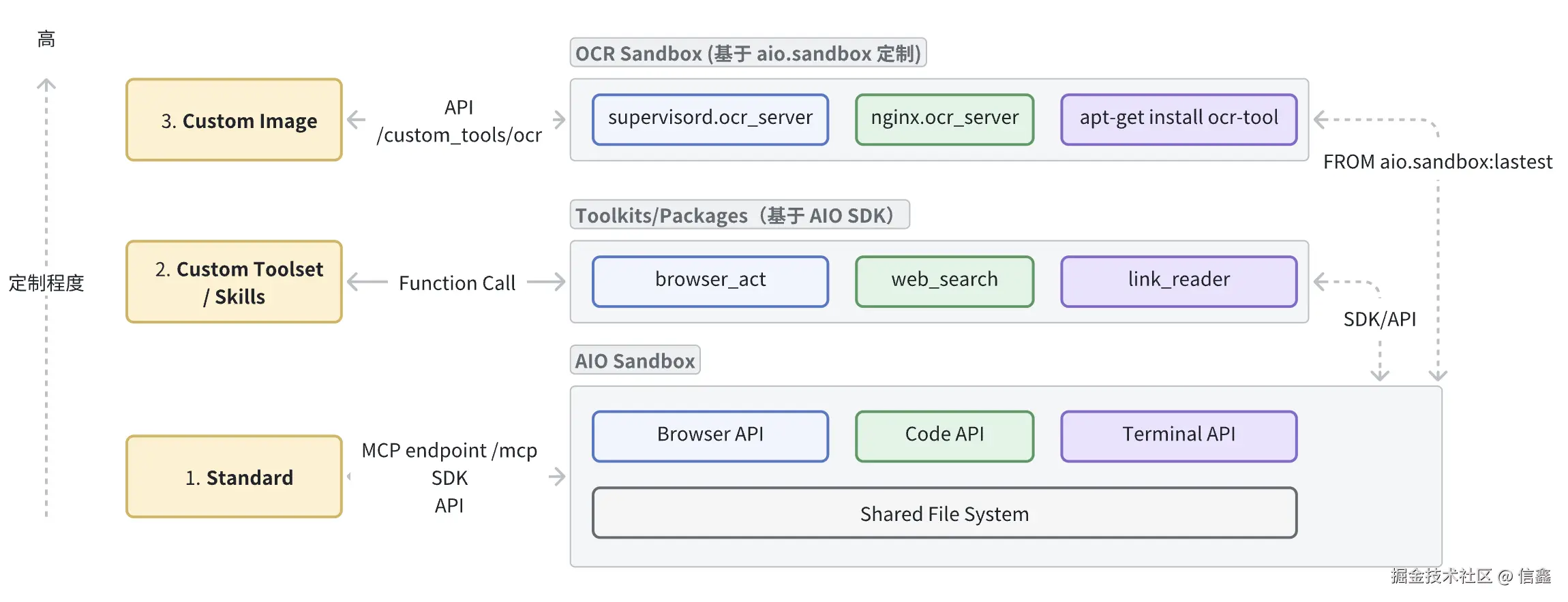 AIO Sandbox 面向 Agent 提供 Browser、File、Shell、Code 等基础能力,提供可扩展性 支持开发者根据 Agent 需求组合与定制专属沙箱 (如AIO Sandbox for 移动端/医疗/法务/金融/科研)。 沙箱定制程度依次递增: