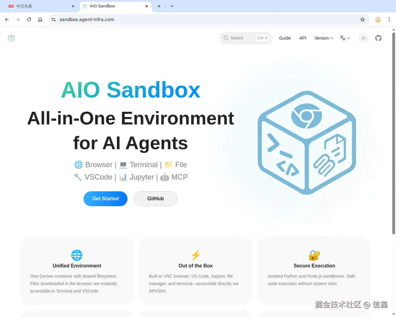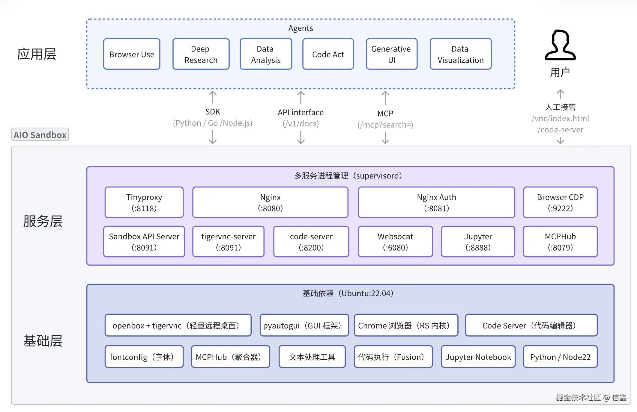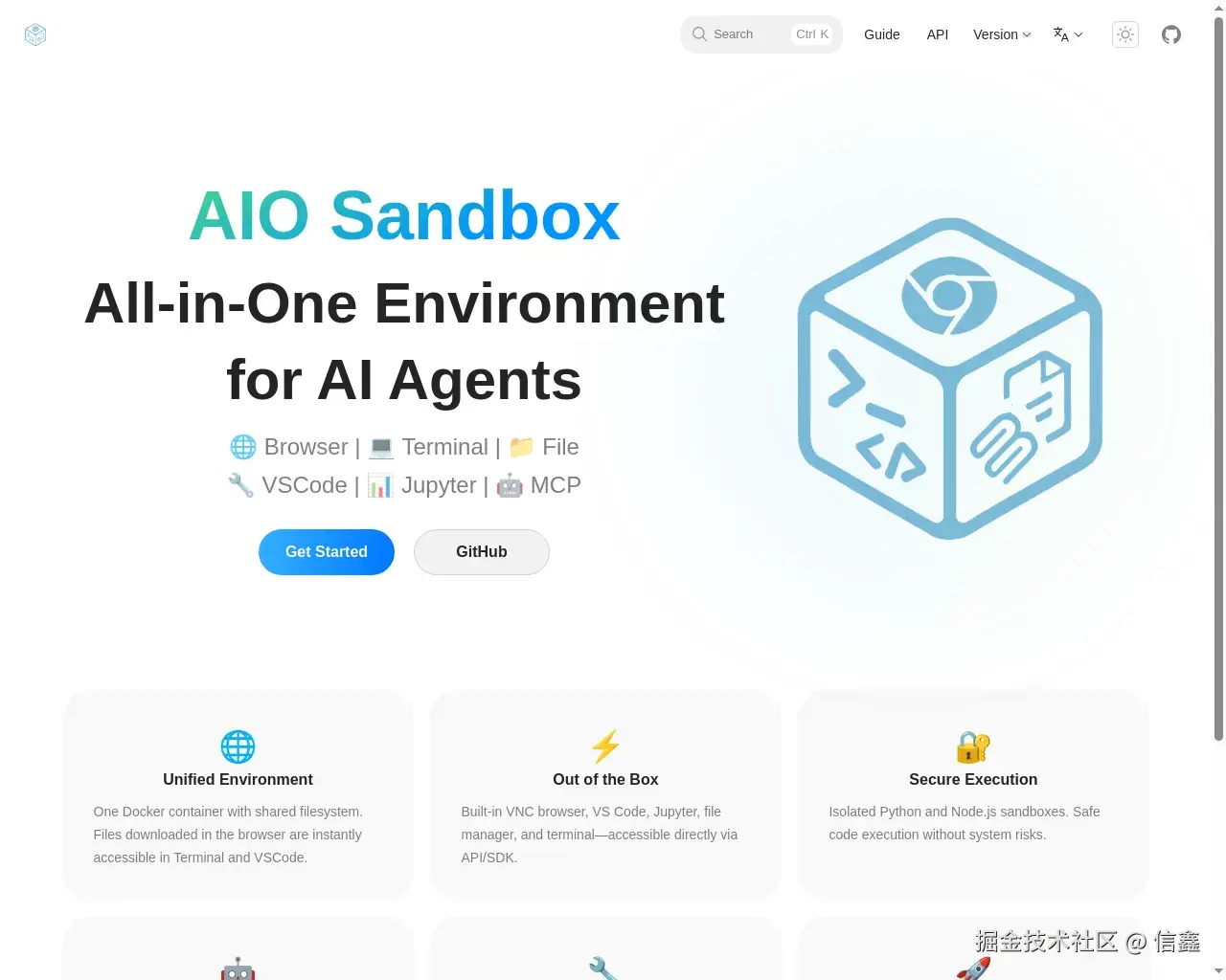 一句话介绍:AIO Sandbox 在一个沙盒内 中集成浏览器 、代码执行 、终端 、可视化接管 、正反向代理 、MCP 、鉴权 等基础功能,可根据需求进行沙盒环境定制,让不同的 Agent "在一个环境容器内中更高效地完成任务"。