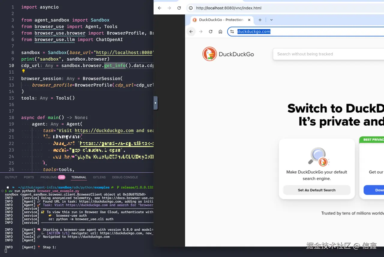 面向 Agent 的浏览器环境,核心在于提供出 CDP 和 VNC,主流 Browser Use 框架都可以直接使用; AIO 提供了基于 x11 的浏览器 GUI 视觉操作接口,可以与 CDP 方式组合出更高效、更低风控率的 Browser Use 方案。