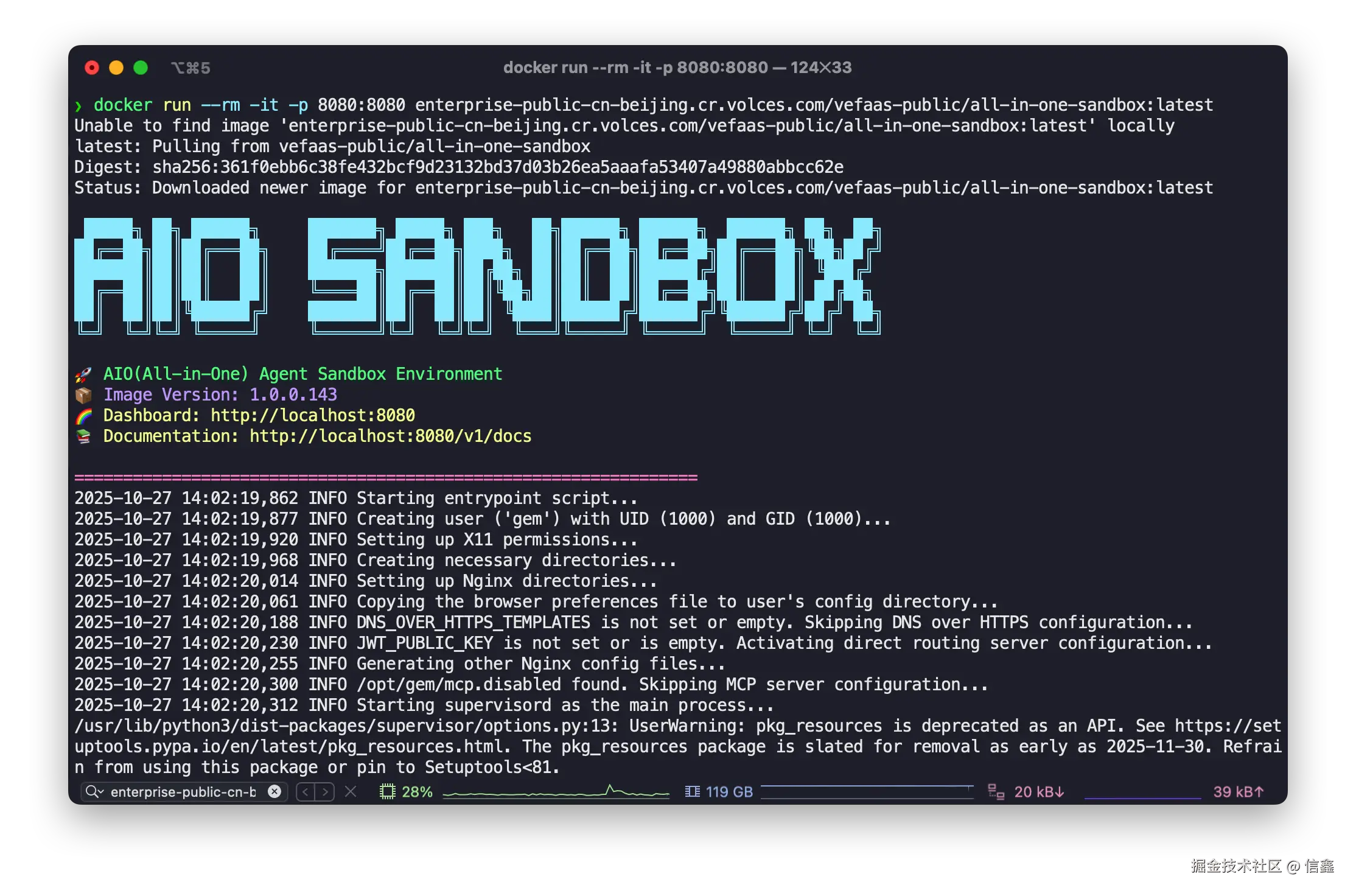 # docker run --security-opt seccomp=unconfined --rm -it -p 8080:8080 enterprise-public-cn-beijing.cr.volces.com/vefaas-public/all-in-one-sandbox:latest
