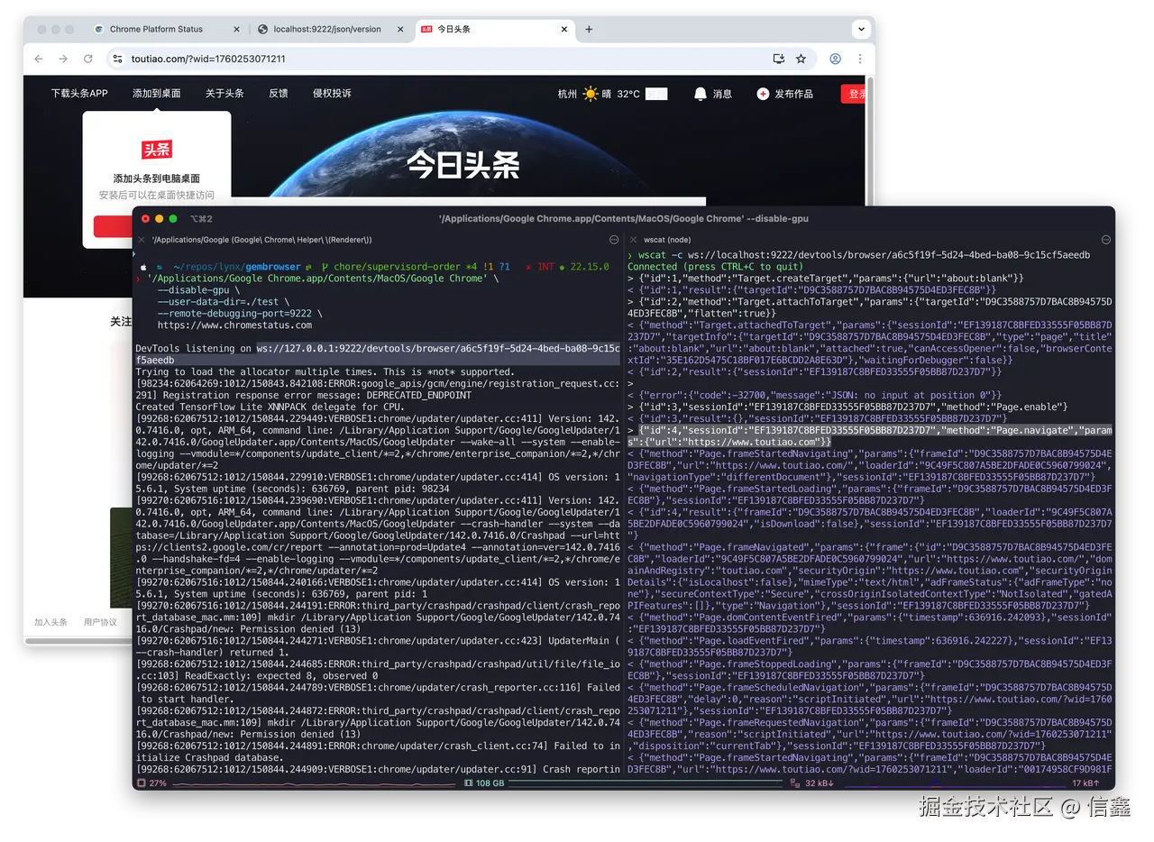 CDP (Chrome Devtools Protocol)是一种用于与 Chrome 或 Chromium 浏览器通信的协议,通过 WebSocket 提供浏览器控制 API,可以执行导航与加载、DOM 操作、JS 执行/调试、网络拦截与模拟、截图与渲染、安全与权限等。 为更直观了解,以下示例是用 CDP 发起一个 navigate 页面导航指令: