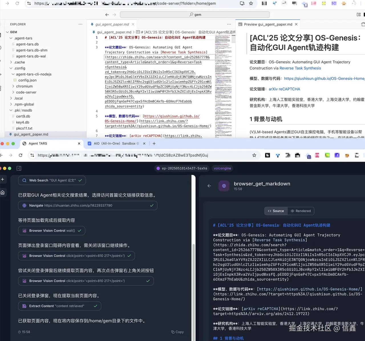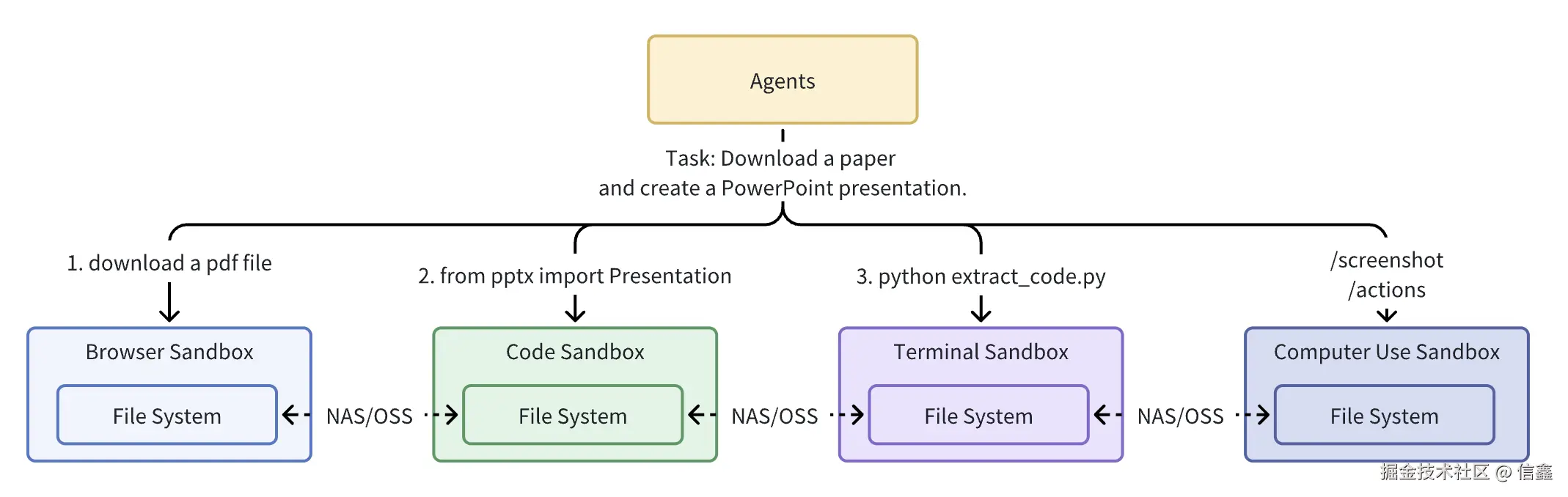 - 🧩 环境割裂:多个单功能沙盒(如 E2B 支持代码执行,Browserbase 支持浏览器)迫使 Agent 通过 NAS/OSS 跨沙箱传输数据,增加延迟与复杂度。如:深度研究 Agent 完成『将一篇论文 Paper 做成 PPT』需在多沙箱间交换数十个中间文件(JSON 配置、图表图片、预览截图等),增加整个 Agent 系统复杂度和开销。