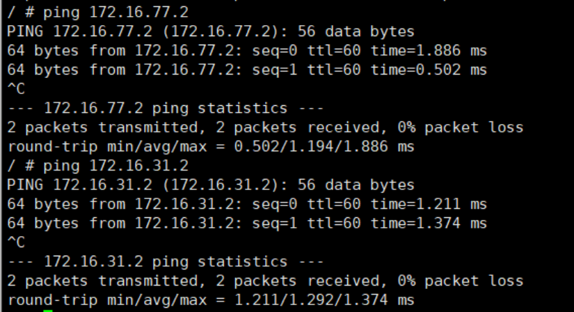 / # ping 172.16.31.2 //测试和其他docker宿主机之间通信