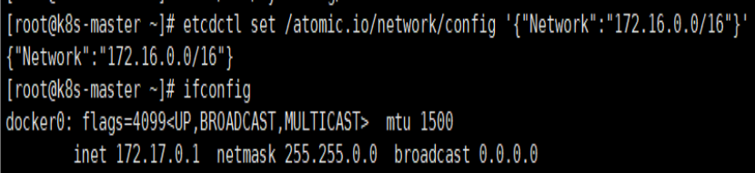 [root@k8s-master ~]# etcdctl set /atomic.io/network/config '{ "Network": "172.16.0.0/16" }' //配置网络