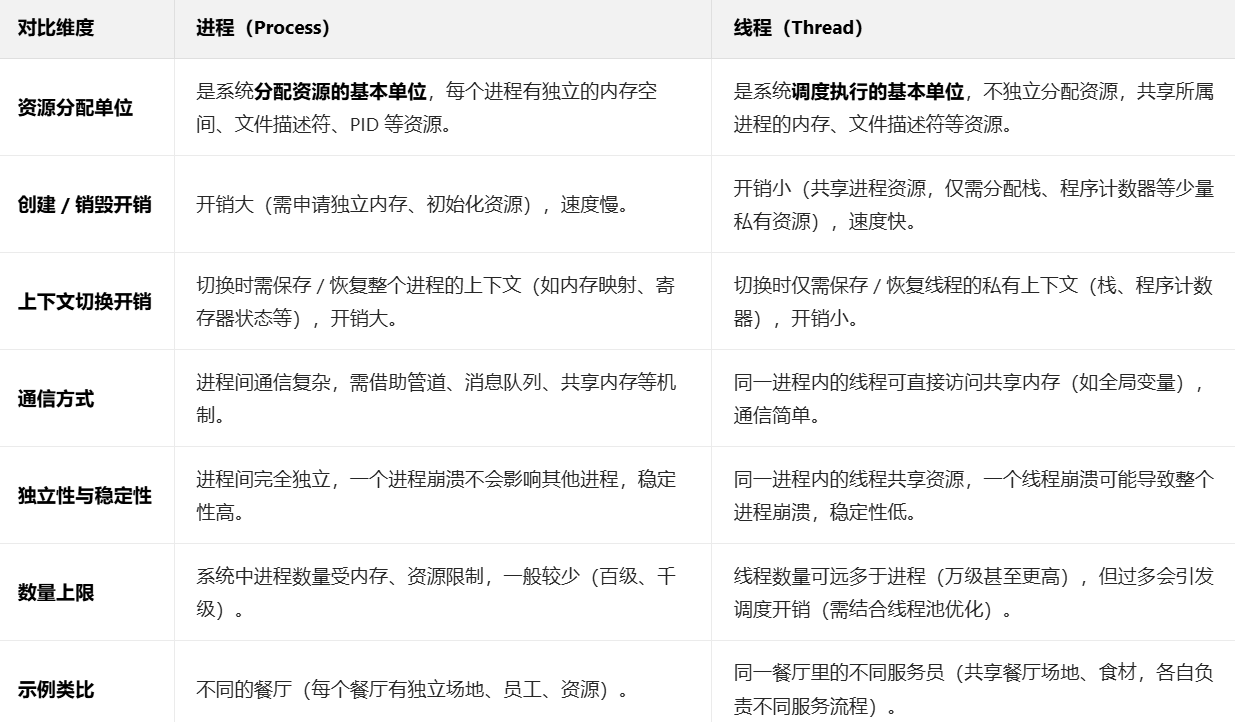 - 上下文切换开销:进程切换时,因为各自独立,要保存和恢复大量信息,开销大,就像把一个大房子里的所有东西都收拾好放到一边,再把另一个大房子的东西拿出来布置,很麻烦。线程切换相对简单,因为共享进程的资源,开销小,类似大房子里不同人的位置变换,没那么复杂。