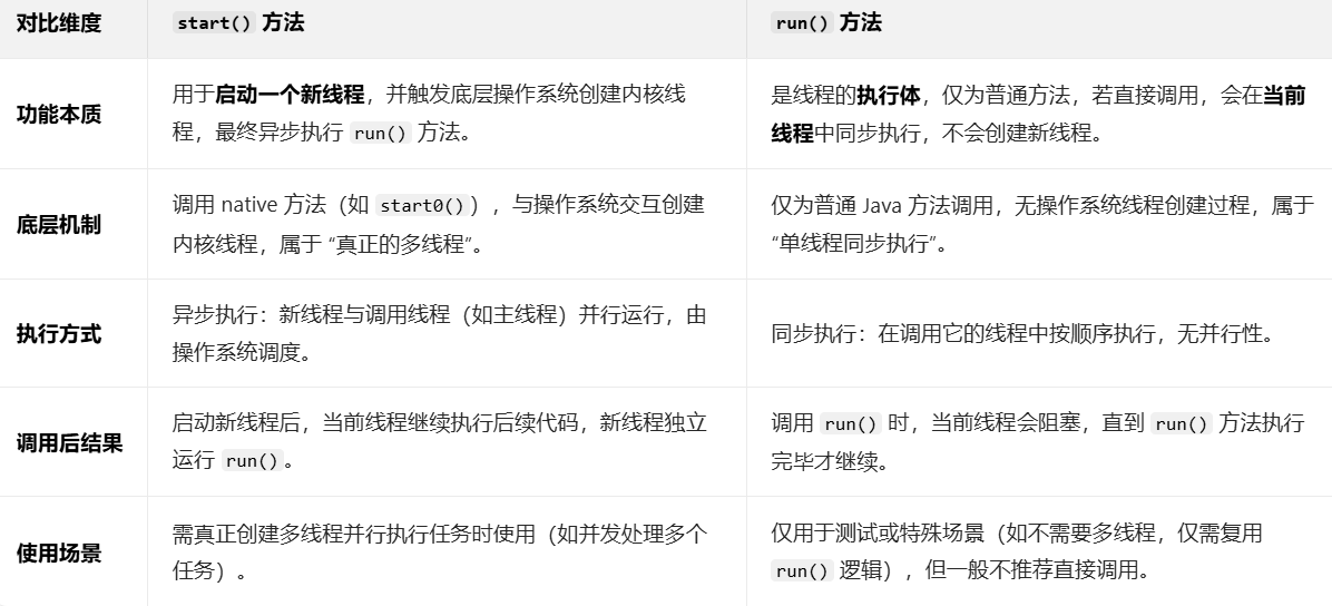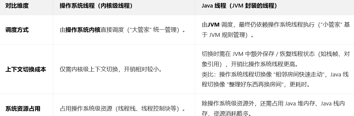 - 调度方式:操作系统线程由操作系统内核调度,而 Java 线程是由 JVM 调度。可以理解为,操作系统线程是听从操作系统这个 "大管家" 的安排,Java 线程则是在 JVM 这个 "小管家" 的管理下运行 。