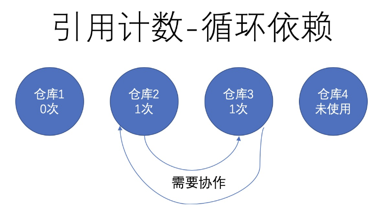 这时候单纯的引用计数就会出问题,循环依赖的仓库/对象没办法回收,就像数据库的死锁一样让人讨厌,你没法让它自己变成 0。