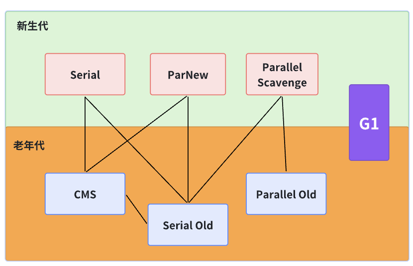 HotSpot虚拟机中的七个垃圾收集器,图中有连线代表可以一起搭配使用