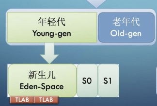 年轻代中又分为一个新生代(Eden),两个幸存者空间(Survivor)。对象会首先在年轻代中的 Eden 区进行分配,通常会有多个线程同时创建多个对象,所以 Eden 区被划分为多个 线程本地分配缓冲区 (Thread Local Allocation Buffer,简称 TLAB)。通过这种缓冲区划分,大部分对象直接由 JVM 在对应线程的 TLAB 中分配,避免与其他线程的同步操作。如果 TLAB 中没有足够的内存空间,就会在共享 Eden 区(shared Eden space)之中分配。当 Eden 区分配满的时候,就会触发年轻代的 GC。