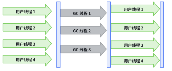 ParNew和串行GC在算法上相似,不一样的点在于并行GC的年轻代在执行"复制"阶段时都使用多个线程。通过并行执行,使得 GC 时间大幅减少。
