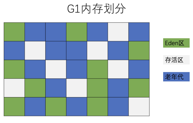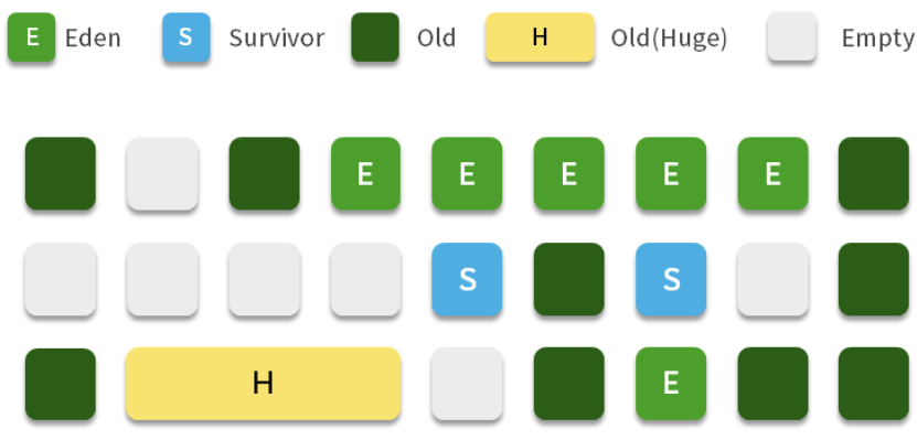 首先,堆不再分成年轻代和老年代,而是划分为多个(通常是 2048 个)可以存放对象的 小块堆区域(smaller heap regions)。每个小块,可能一会被定义成 Eden 区,一会被指定为 Survivor 区或者 Old 区。所以Region成为了垃圾收集器的最小单位,每一次回收都会是Region的整数倍大小。在逻辑上,所有的 Eden 区和 Survivor 区合起来就是年轻代,所有的 Old 区拼在一起那就是老年代,如下图所示: