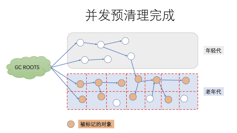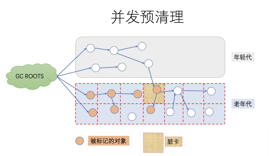 在预清理阶段,这些脏对象会被统计出来,它们所引用的对象也会被标记。此阶段完成后,用以标记的 card 也就会被清空。