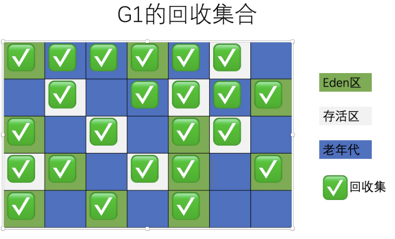 这样划分之后,使得 G1 不必每次都去收集整个堆空间,而是以增量的方式来进行处理:每次只处理一部分内存块,称为此次 GC 的回收集(collection set)。每次 GC 暂停都会收集所有年轻代的内存块,但一般只包含部分老年代的内存块,见下图带对号的部分: