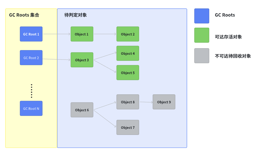 这种使用 tracing 方式寻找存活对象的方法,还有一个好听的名字,叫作可达性分析法。