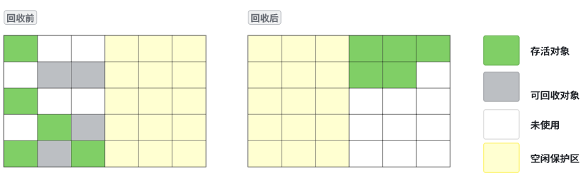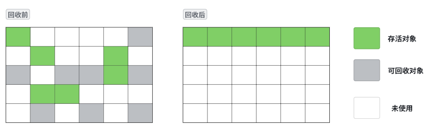 首先找出所有对象,将存活的对象进行标记,然后将存活对象整理到一端,把其他内存区域直接清理掉