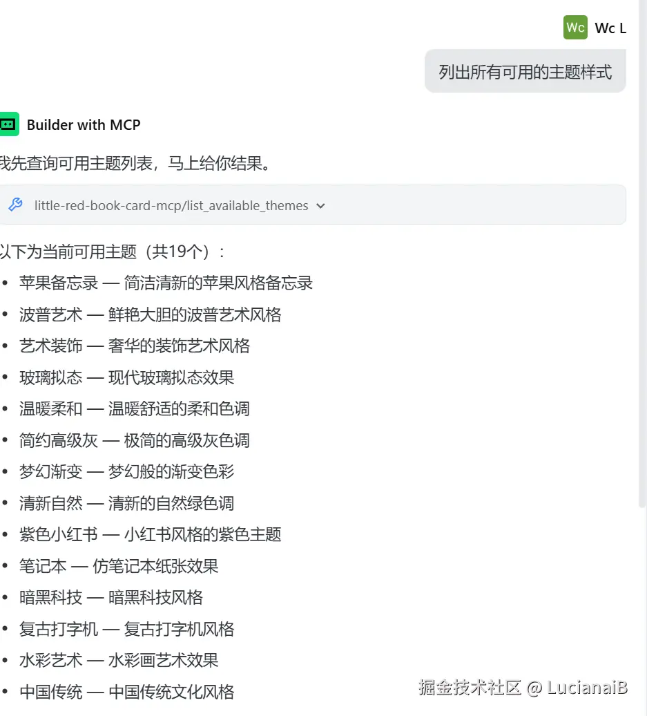 对它说:列出所有可用的主题样式,可以看到,成功的列出了我们初始化时给出的19个主题。