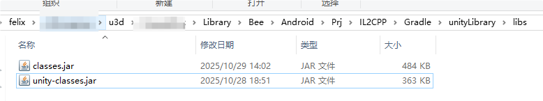 原来是Unity有缓存机制,为了加快打包速度,所以不会每次更新.jar文件,而是将其缓存到"项目名\Library\Bee\Android\Prj\IL2CPP\Gradle\unityLibrary\libs"下,所以我们更新了jar必须要把他删除才行,这样才会及时更新。