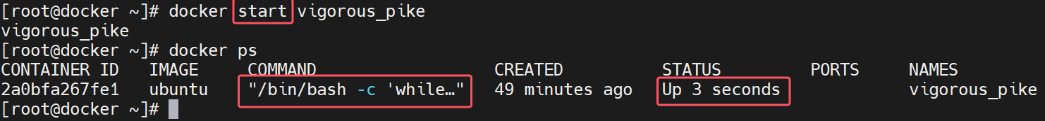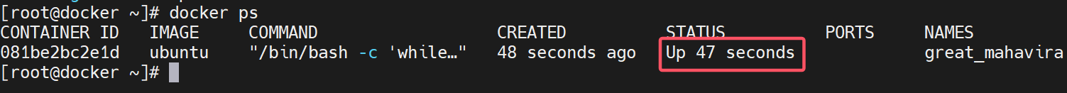 [root@docker ~]# docker run -d ubuntu /bin/bash -c "while true ; do sleep 1 ; echo I_am_in_container ; done"