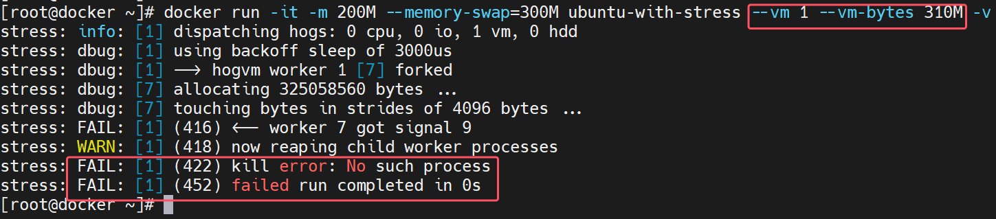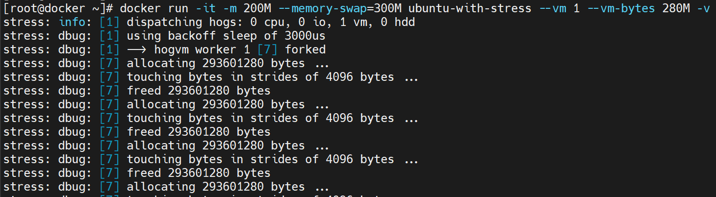 [root@docker ~]# docker run -it -m 200M --memory-swap=300M ubuntu-with-stress --vm 1 --vm-bytes 280M -v