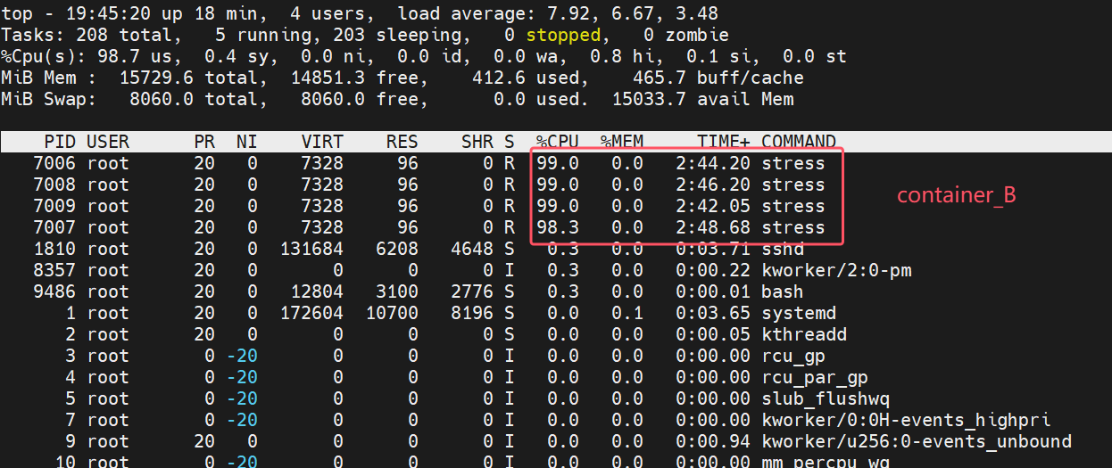 top显示 container_B 在 container_A 空闲的情况下能够用满整颗 CPU: