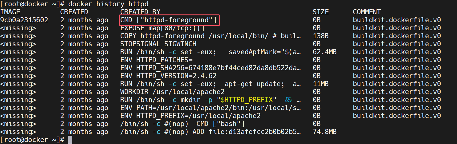 这一次我们用 --name 指定了容器的名字。 我们还看到容器运行的命令是httpd-foreground,通过 docker history 可知这个命令是通过 CMD 指定的。