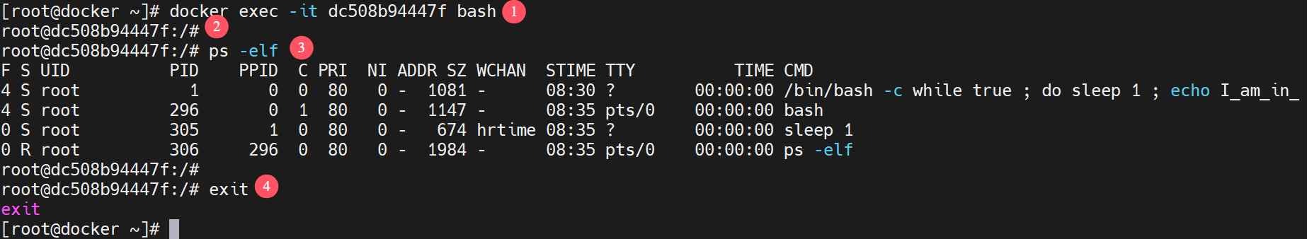 ③ 可以像在普通 Linux 中一样执行命令。ps -elf 显示了容器启动进程while 以及当前的 bash 进程。