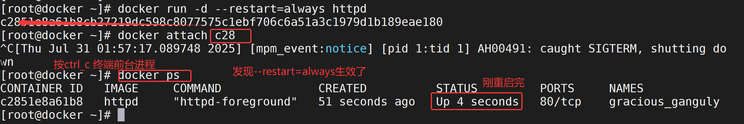 可见容器仍处于运行状态。不过这种方法有个缺点:它占用了一个终端。