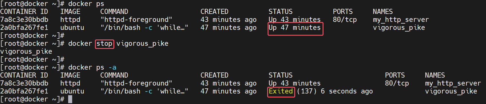 对于容器的后续操作,我们需要通过 "长ID"、"短ID" 或者 "名称" 来指定要操作的容器。比如下面停止一个容器: