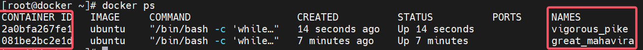 现在我们有了两个正在运行的容器。这里注意一下容器的 CONTAINER ID和 NAMES 这两个字段。