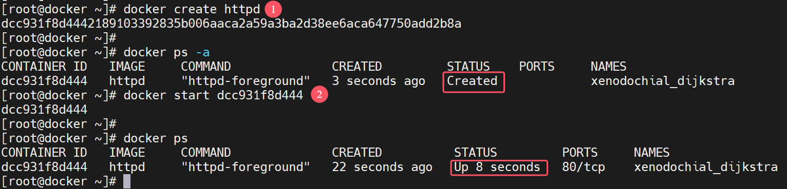 docker start将以后台方式启动容器。docker run命令实际上是docker create和docker start的组合。 -