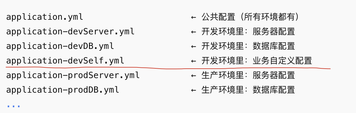 如果全部写在 application-dev.yml,文件会变得又大又乱,不好维护。