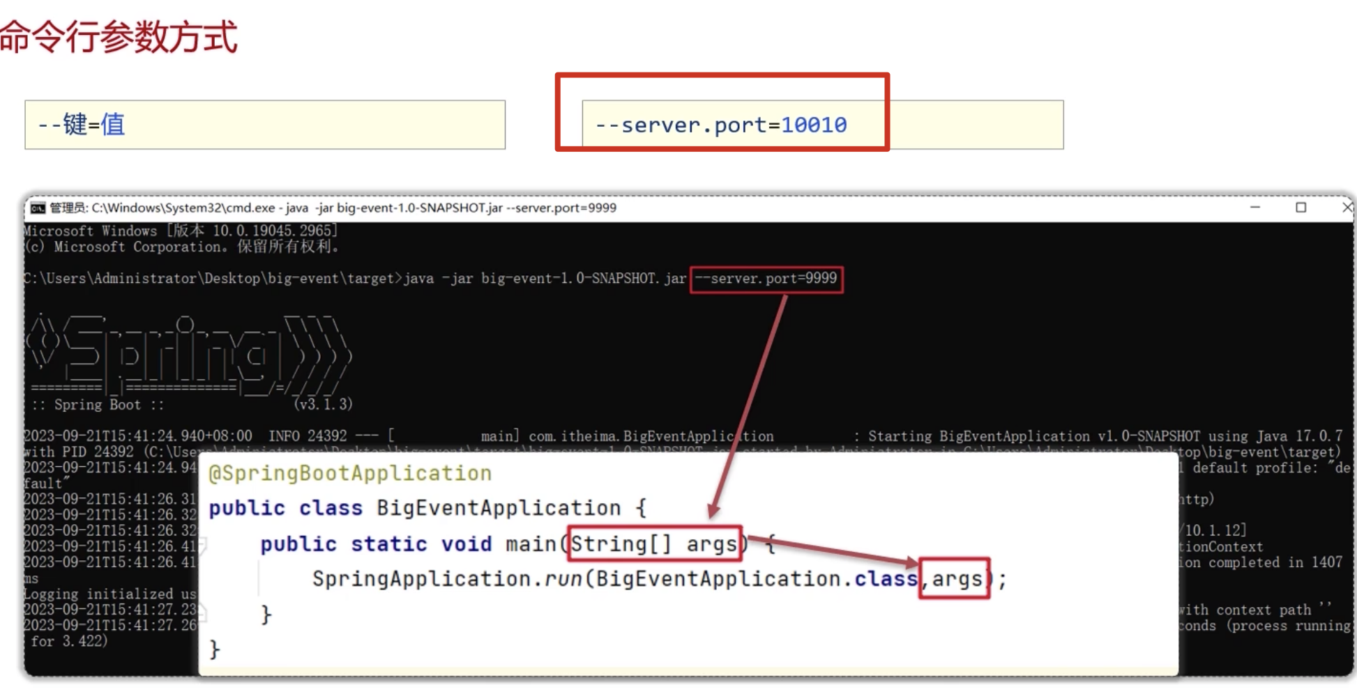 | 1 | 启动命令参数 | java -jar app.jar --server.port=9999 |